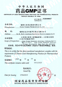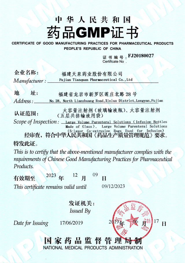 大容量注射劑(玻璃輸液瓶、五層共擠輸液用袋 )GMP證書(shū)